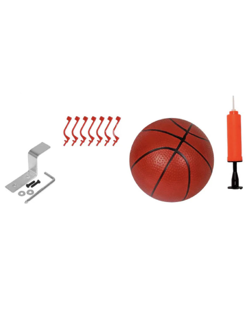 تتضمن المجموعة لوحة خلفية لكرة السلة، وملحقات، وشبكة، وخطاف، وكرة وإبرة
